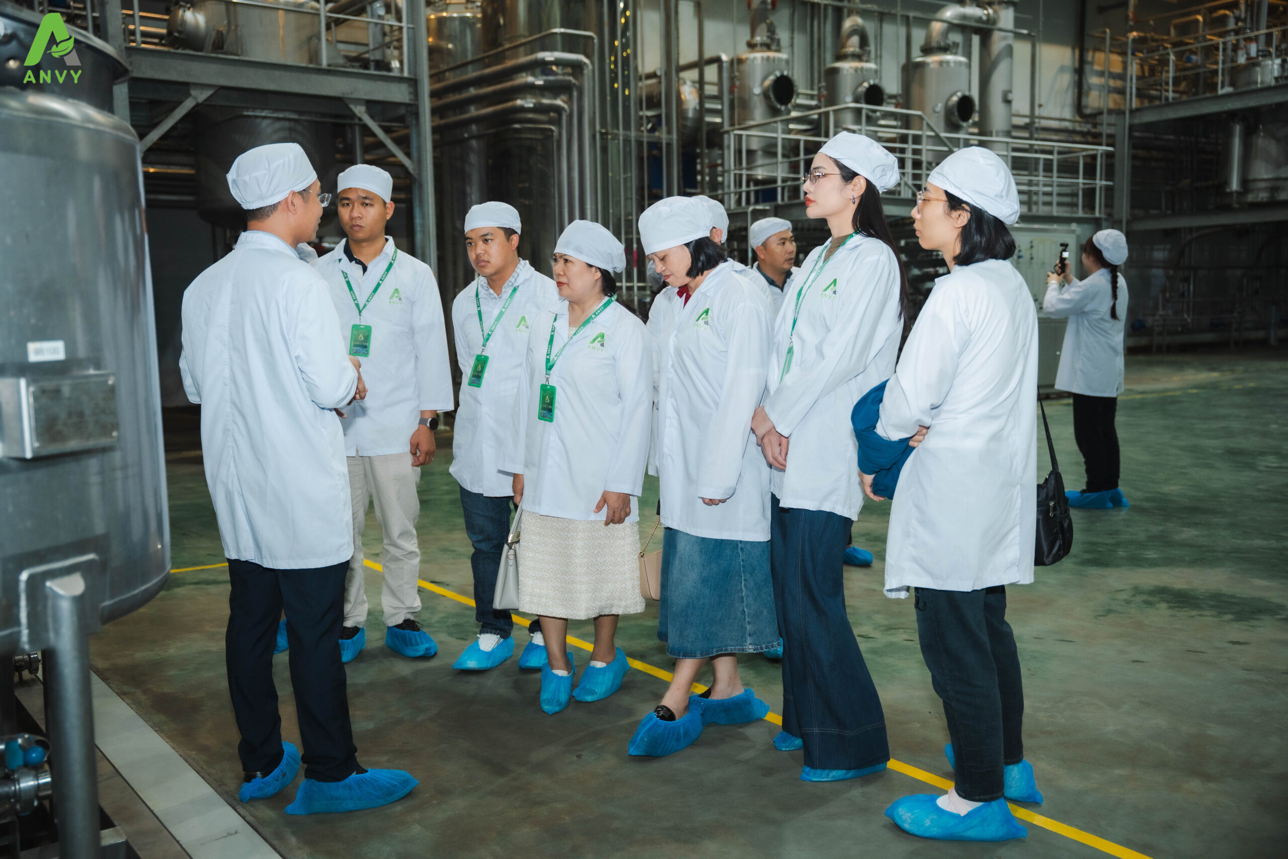 Điểm nhấn của hành trình là chuyến tham quan thực tế nhà máy, dưới sự dẫn dắt của Ban lãnh đạo và đội ngũ sản xuất. Tại đây, các đối tác có cơ hội quan sát trực tiếp dây chuyền sản xuất hiện đại, công nghệ chiết xuất EECV, cũng như quy trình kiểm soát chất lượng nghiêm ngặt – những yếu tố cốt lõi làm nên năng lực sản xuất và phát triển bền vững của Anvy.
